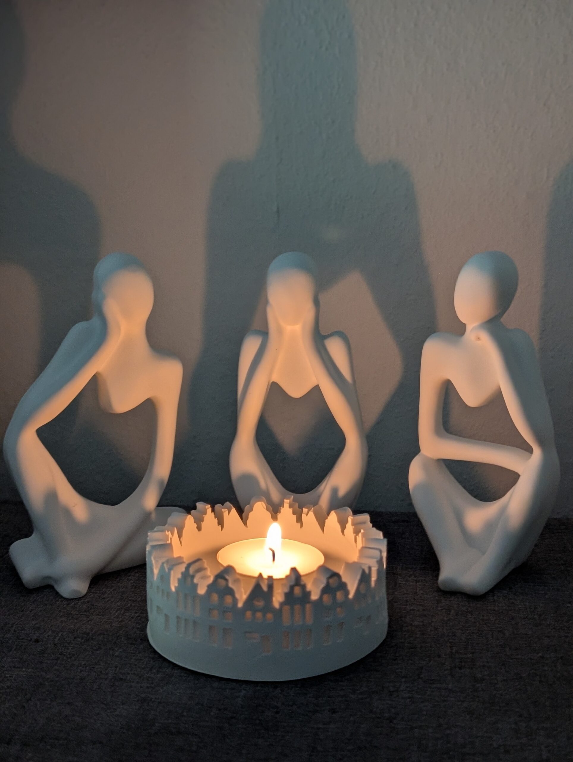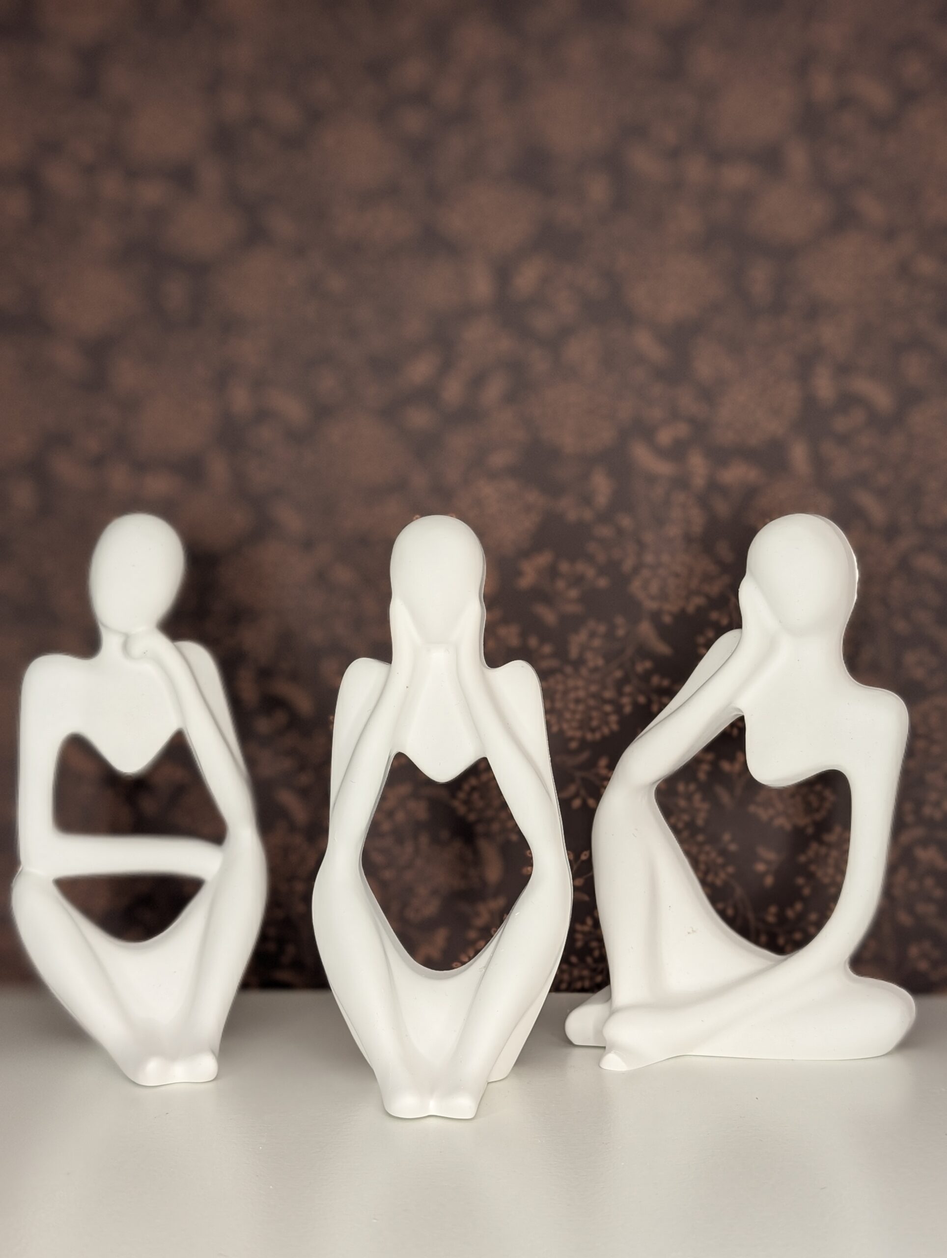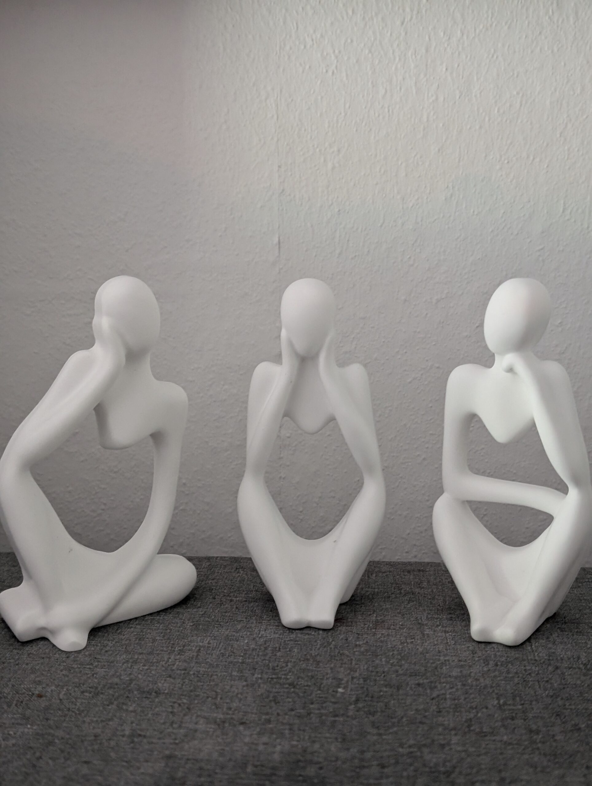 Jede Figur stellt eine stilisierte menschliche Gestalt in einer meditativen oder nachdenklichen Pose dar. Durch die offenen Formen und fließenden Linien wirken sie leicht und zugleich ausdrucksstark – perfekt geeignet für moderne Wohnräume, Büros oder kreative Umgebungen. Das schlichte Weiß harmoniert mit nahezu jedem Einrichtungsstil und setzt stilvolle Akzente auf Regalen, Kommoden oder Sideboards.